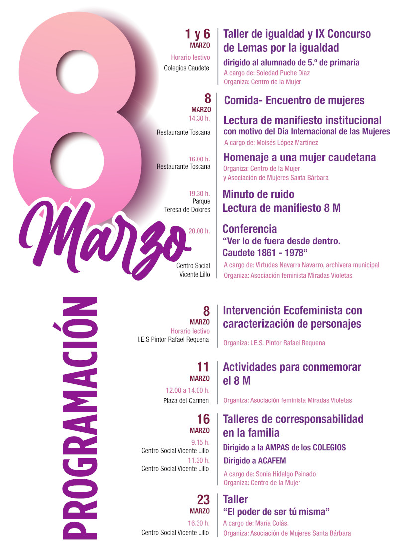 El día 8 de Marzo, tendrá lugar un encuentro-comida de mujeres y hombres para reivindicar nuestra lucha contra la desigualdad, en el que se lleva a cabo la lectura del Manifiesto Institucional y un homenaje a una mujer caudetana que ha destacado por su labor en campos tradicionalmente reservados a los homenaje a una mujer caudetana.