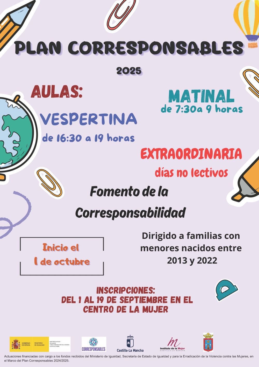 Desde la Concejalía de Igualdad se informa que desde el 1 de septiembre estará abierto el plazo para inscribirse en las actividades que se desarrollarán a través del Plan Corresponsables durante el curso 2025-2026.