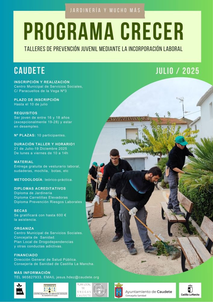 El Programa CRECER 2025 está destinado a jóvenes de Caudete con edades comprendidas entre los 16 y 28 años. Tendrá una duración de 5 meses, comenzando el próximo 21 de julio y finalizando alrededor del 19 de diciembre, en horario de mañana, de 10:00 a 14:00 horas.