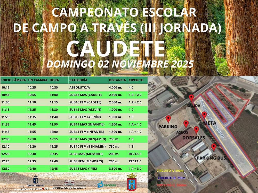 El municipio de Caudete se convertirá este domingo, 2 de noviembre, en el epicentro del atletismo provincial al acoger una de las cuatro pruebas que conforman el calendario de Campo a Través Escolar. Este evento se enmarca dentro del programa “Somos Deportes 3-18”, impulsado por la Junta de Comunidades de Castilla-La Mancha y organizado en colaboración con la Excma. Diputación Provincial de Albacete, y en este caso también con el M.I. Ayuntamiento de Caudete.