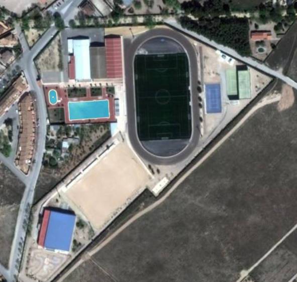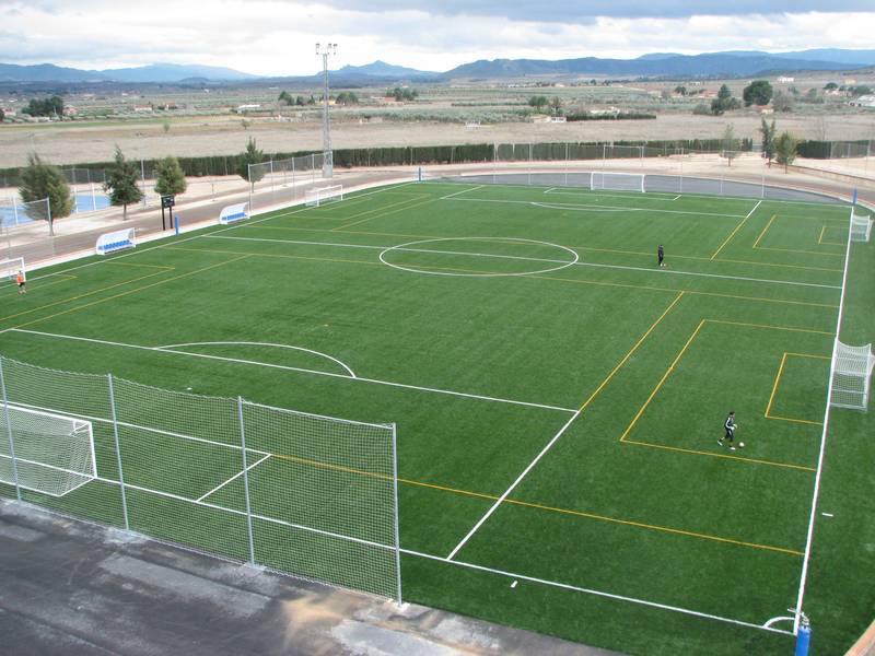 - 4. Campos de Fútbol. Desde el año 2011 el campo de fútbol fue remodelado íntegramente, dejando de tener un pavimento de tierra para dotarlo con una superficie de césped sintético de tercera generación, caracterizado por contar cada uno de sus filamentos con tres nervios, uno central y dos laterales, que permiten mejorar la resistencia del mismo. Su marcaje permite la práctica alternativa de un encuentro de fútbol 11, o bien, de hasta dos partidos de fútbol 7. Para su riego cuenta con un deposito de recogida de aguas pluviales con el fin de evitar el consumo de agua de red.
