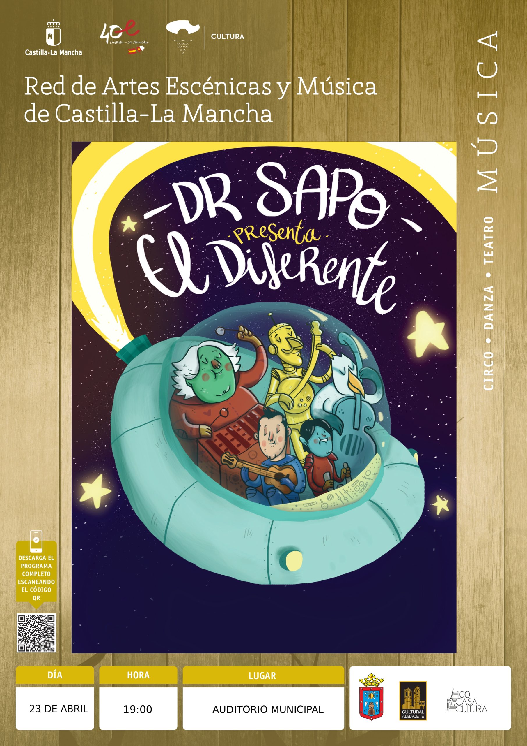 El Diferente nos sumerge en el universo imaginario del Dr. Sapo, donde la música sirve como herramienta para que los niños convivan y se identifiquen con el personaje protagonista, viajando a través de sus emociones, sus alegrías y sus pasiones. De esta forma se trabaja la educación, la tolerancia, el respeto y la comprensión de nuestro interior. Para ello Miguel de Lucas (Dr. Sapo) viene arropado por toda su banda, liderada por el prestigioso músico y productor Fernando Polaino, al que acompañan Pepe López a la batería, y Álvaro Barco al contrabajo. A su vez, Marta Marco también se incorpora a la banda, aportando la sensibilidad de su voz, coros y bailes. Todos juntos consiguen un espectáculo muy completo, en el que también hay espacio para la interpretación, la magia y el humor. Una combinación perfecta que engancha al público desde el primer momento, haciéndole participar de forma activa en el show, con una puesta en escena cuidada al detalle.