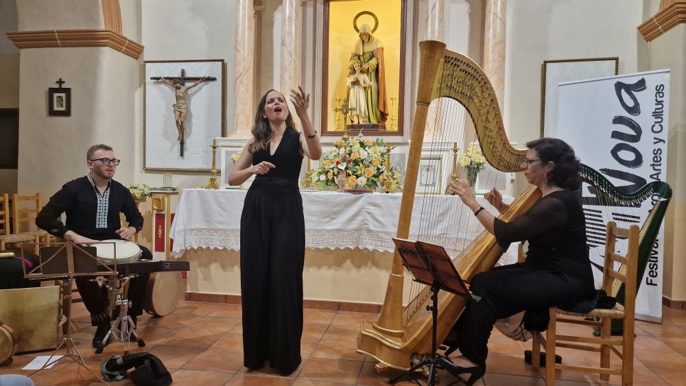 El festival arrancó el viernes con la actuación de Anemocoria, el grupo formado por la voz de Quiteria Muñoz y el arpa de Úrsula Segarra, con la colaboración del percusionista Onofre Serer. El trío presentó un repertorio que fusionó la música tradicional sefardí y las melodías populares españolas, ofreciendo un viaje sonoro por el Mediterráneo y sus ricas tradiciones.