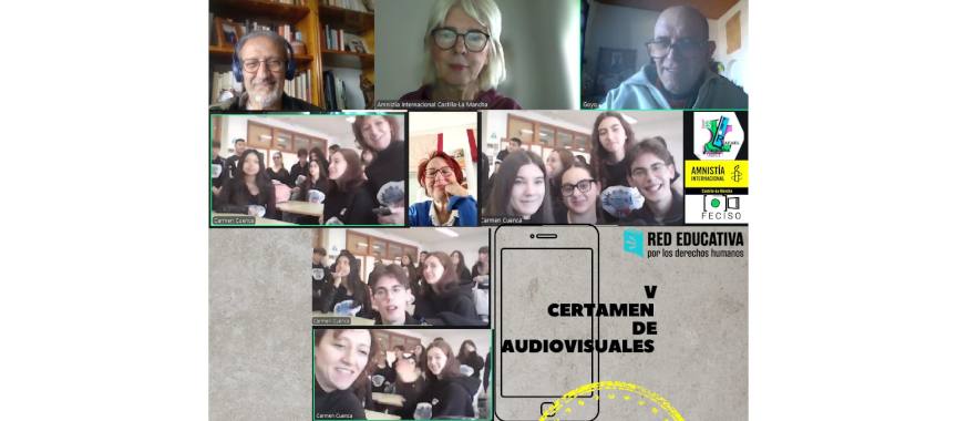 El alcalde, José Miguel Mollá Nieto, y la concejal María Martínez García felicitan al alumnado de 2º de Bachillerato del IES Pintor Rafael Requena por el reconocimiento obtenido en el certamen de audiovisuales por los Derechos Humanos de Amnistía Internacional Castilla-La Mancha, con su trabajo “La voz de todos”.