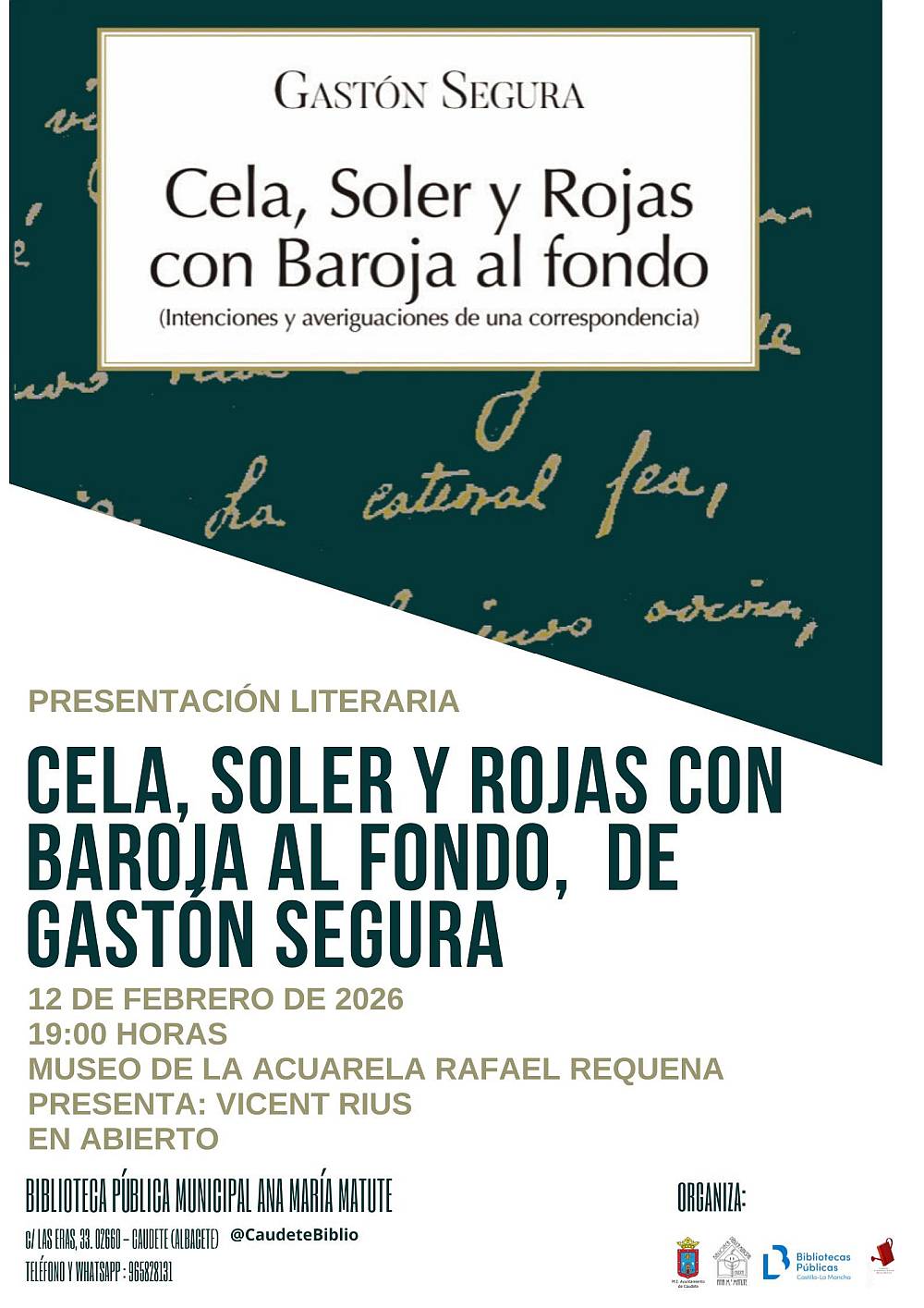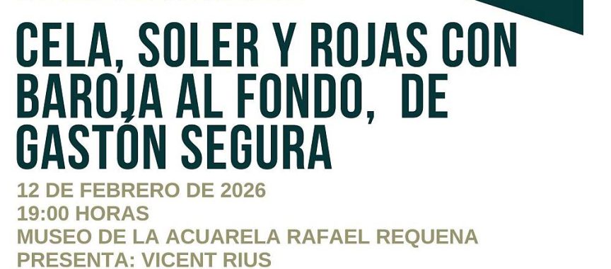 La Concejalía de Cultura, a través de la Biblioteca Pública Municipal “Ana María Matute”, organiza la presentación del libro Cela, Soler y Rojas con Baroja al fondo, del escritor Gastón Segura Valero, que tendrá lugar el jueves 12 de febrero, a las 19:00 horas, en el Museo de la Acuarela Rafael Requena. El acto será de acceso libre hasta completar aforo y contará con la presencia del editor de la obra Julio Guillén Domene y Vicent Salvador Rius Bañuls, en la presentación.