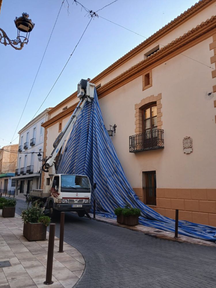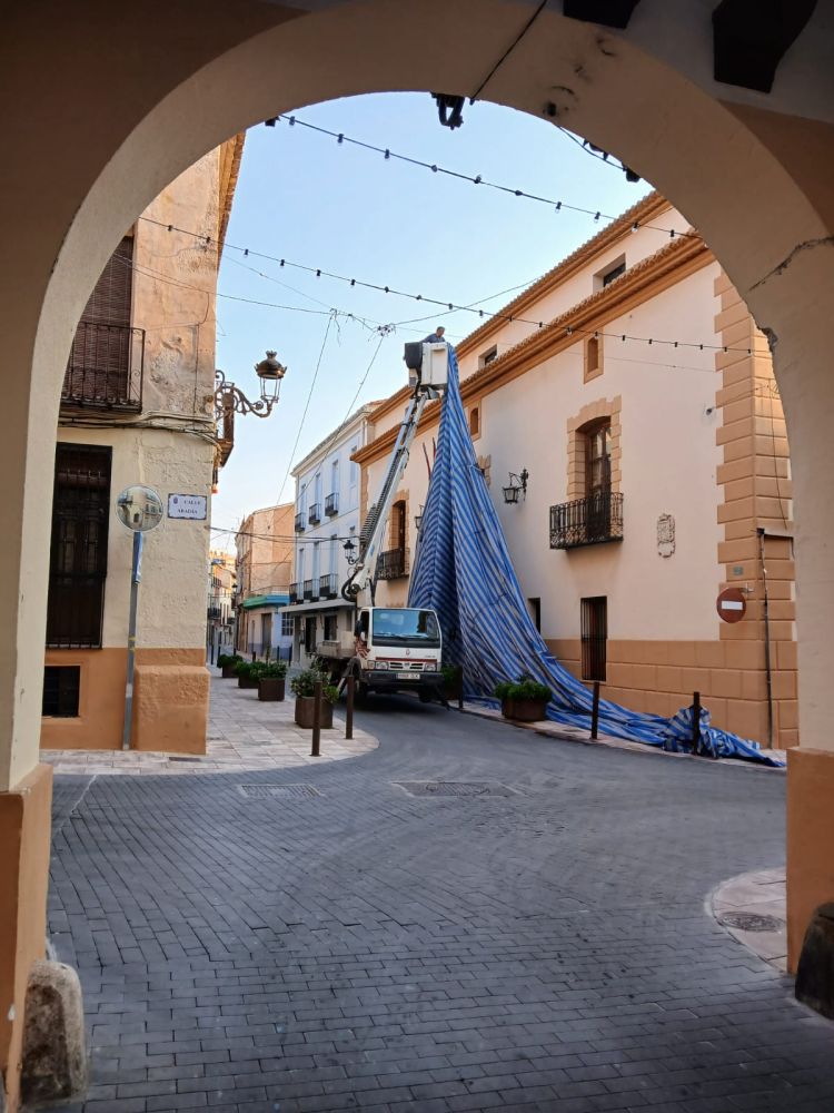 La semana anterior quedó ya instalado el toldo de la puerta del ayuntamiento, así como finalizada la instalación de las ristras de alumbrado especial que discurre por gran parte del trayecto de la procesión y parte del recorrido de la entrada; quedando para los próximos días la instalación del Arco de la Virgen en la Puerta La Villa.