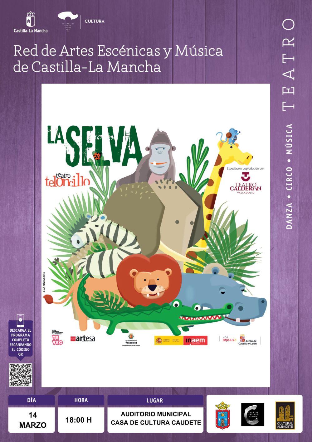 La Concejalía de Cultura presenta “La Selva” un teatro recomendado para niños y niñas a partir de 6 meses hasta 5 años que podrá disfrutarse en el Auditorio Municipal el próximo sábado 14 de marzo de 2026 a las 18:00h. Este espectáculo se encuentra dentro de la Programación Cultural de Primavera 2026 del programa de Red Artes Escénicas y Música de la JCCM, Cultural Albacete y realizado en coproducción con el teatro Calderón de Valladolid.