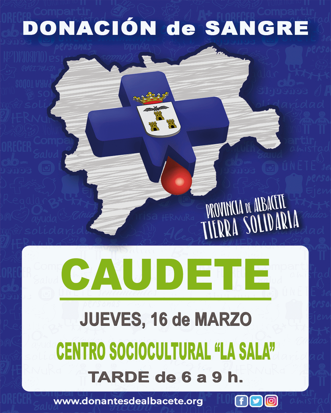 La unidad móvil de la Hermandad de Donantes de Sangre de Albacete llevará a cabo una extracción el próximo JUEVES 16 de marzo en el espacio sociocultural La Sala de Caudete, en horario de tarde de 18:00 a 21:00 horas.
