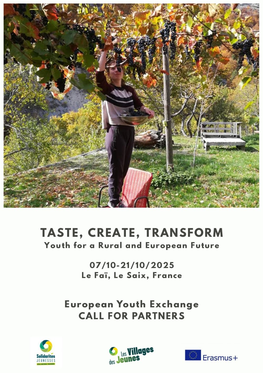 Desde el Centro Joven de Caudete y la Agencia de Desarrollo Local buscamos participantes para el proyecto “Taste, Create, Transform” que tendrá lugar en Le Saix, Hautes-Alpes (Francia) del 7 al 21 de octubre, organizado por las entidades Solidarités Jeunesses, asociación de educación popular que promueve proyectos solidarios y de voluntariado, buscando una sociedad en la que el respecto al ser humano y al medio ambiente son valores principales, y Les Villages des Jeunes, lugar de encuentro de jóvenes, familias, grupos, artistas, turistas, donde personas de todas las edades y contextos sociales del mundo entero trabajan y viven juntos, construyendo un mundo abierto a la diferencia.