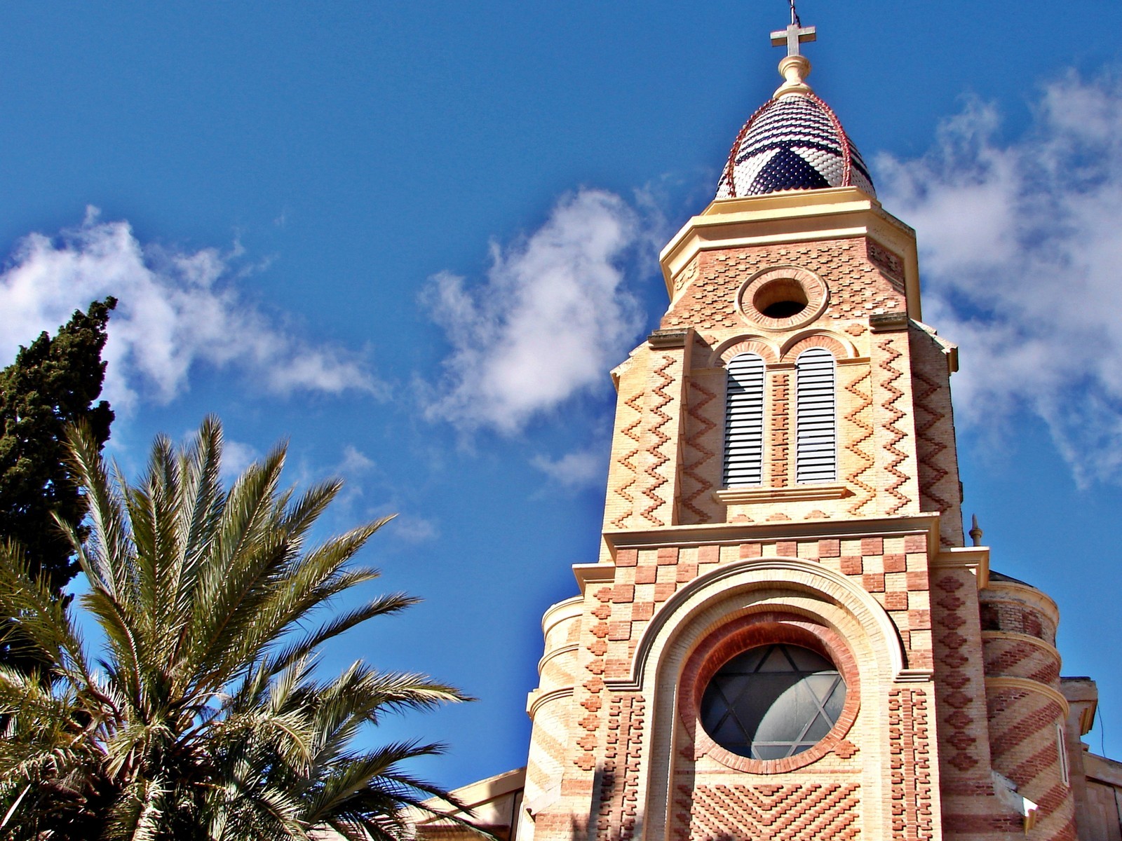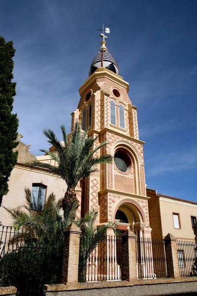 La fachada principal del templo sorprende por su originalidad, destacando su influencia neo-mudéjar. Consta de una sola torre campanario en posición central, flanqueada por robustas columnas salomónicas, y coronada por una curiosa cúpula de reminiscencias bizantinas.
