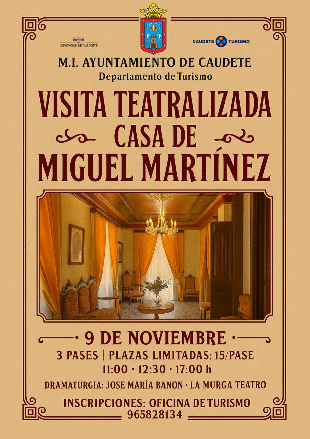 La Concejalía de Turismo del M.I. Ayuntamiento de Caudete comunica que el próximo 9 de noviembre, domingo, se van a realizar visitas teatralizadas a la Casa de Miguel Martínez, actual sede de la Oficina de Turismo.